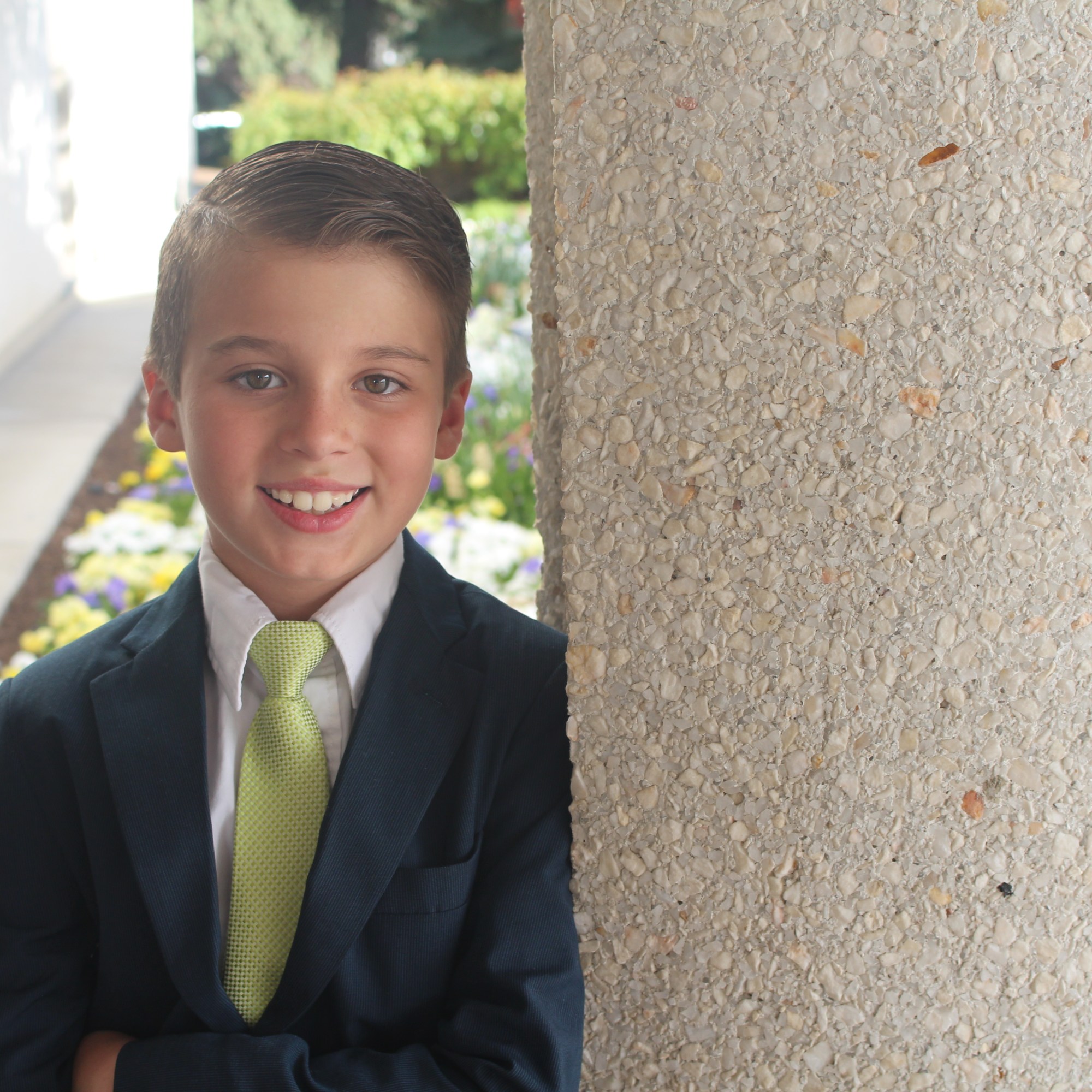 Used photoshop to adjusted levels, whitened teeth, brightened eyes, and add flowers from another photo into the background.